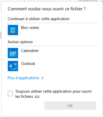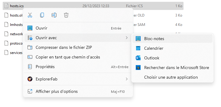 Rien que l’extension .ics laisse penser que Windows 11 est très souvent surveillé. Cette extension permet l’importation de données avec iCalendar et plus généralement interagir entre le calendrier et la messagerie Outlook. La raison pour laquelle il est proposé par défaut d’ouvrir le fichier host avec Calendrier et Outlook.