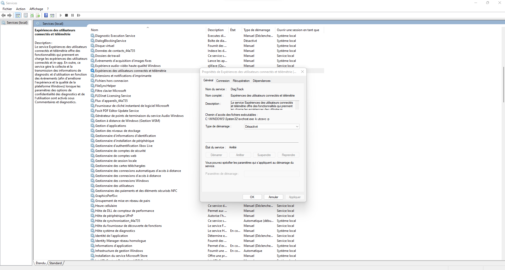 Comme indiqué sur les captures d’écran ci-dessus, le nom du service s’appelle DiagTrack qui signifie en français “suivi d’expérience”. Dans l’onglet Général, vous arrêtez tout d’abord le service. Si l’arrêt met un peu de temps, c’est tout à fait normal. Ensuite, vous choisissez pour le type de démarrage Désactivé et vous appliquez les changements avec le bouton Appliquer.