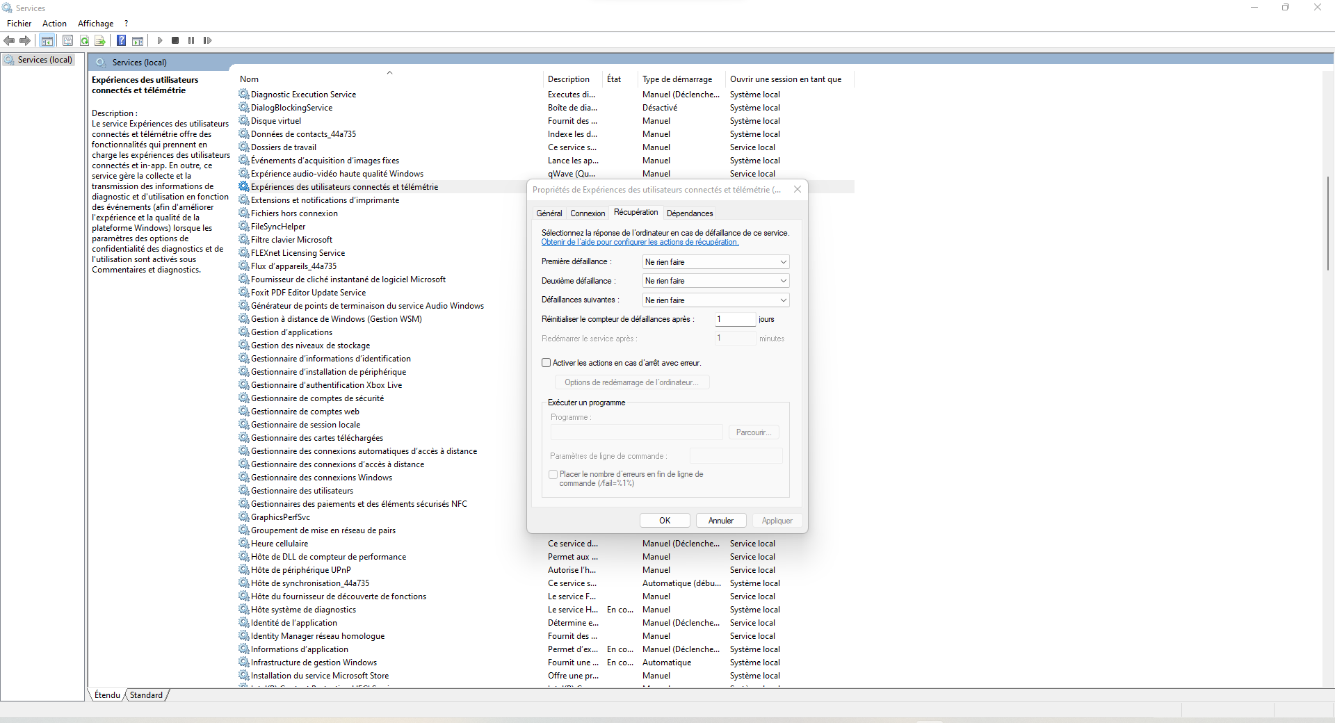 Une fois fait, vous allez dans l’onglet Récupération et vous sélectionnez l’option Ne rien faire pour les 3 cas de défaillance. Vous appliquez les changements et vous pouvez fermer la fenêtre de service soit avec Ok, soit avec Annuler.